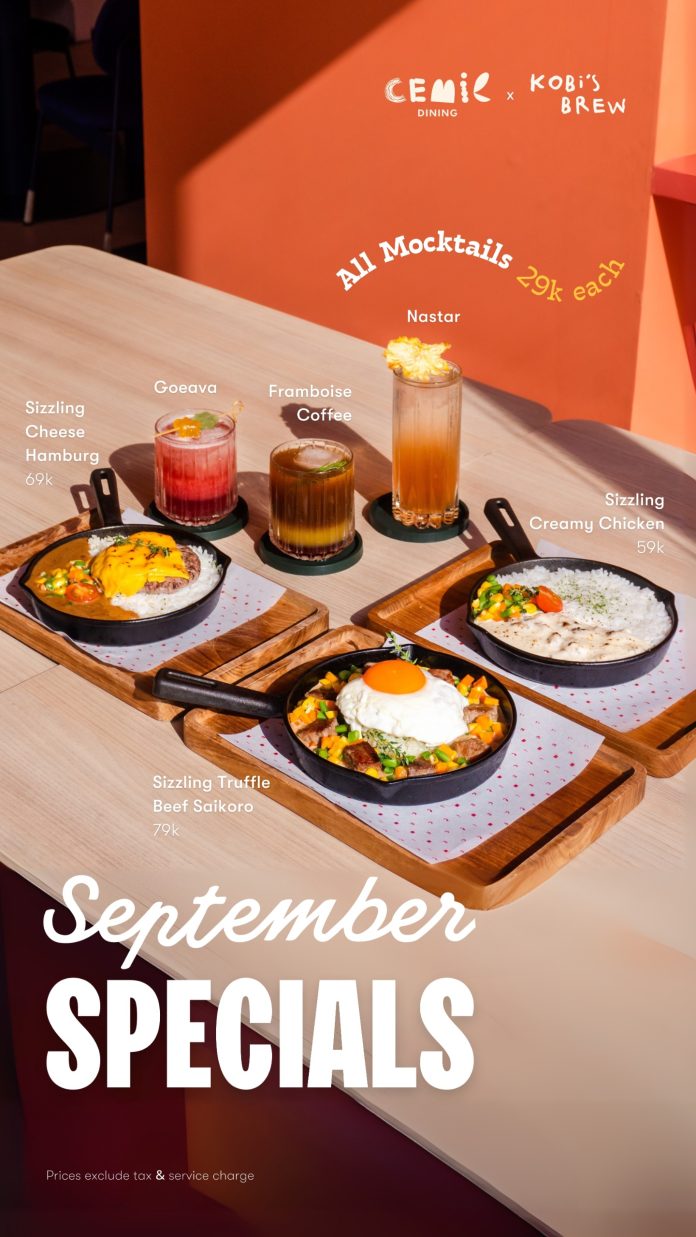 Program ini dirancang sebagai bagian dari penyegaran menu musiman, dengan menghadirkan beragam pilihan makanan dan minuman bernuansa modern. Tamu dapat menikmati sizzling menu khas Cemil Dining yang disajikan di atas hot plate, seperti Sizzling Truffle Beef Saikoro (Rp79.000), Sizzling Cheese Hamburg (Rp69.000), dan Sizzling Creamy Chicken (Rp59.000). Sementara itu, Kobi’s Brew menawarkan tiga varian mocktail segar—Goeava, Framboise Coffee, dan Nastar—dengan harga Rp29.000 per gelas.