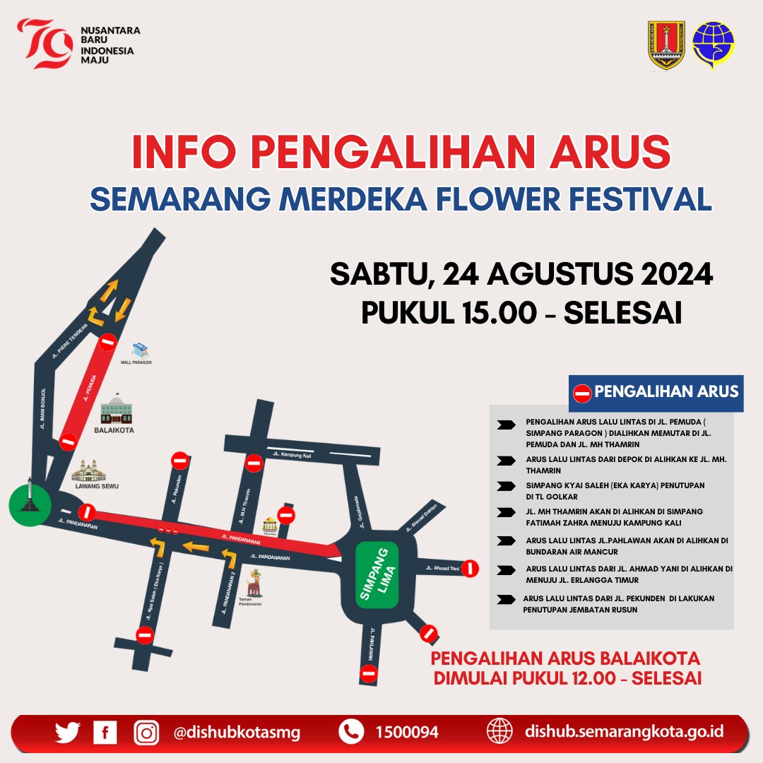 SEMARANG (Pertamanews.id) – Guna mendukung kelancaran event Semarang Merdeka Flower Festival yang diselenggarakan pada Sabtu (24/8), Pemerintah Kota Semarang melalui Dinas Perhubungan Kota Semarang akan memberlakukan pengalihan arus lalu lintas pada sejumlah ruas jalan di sepanjang rute yang dilalui festival.