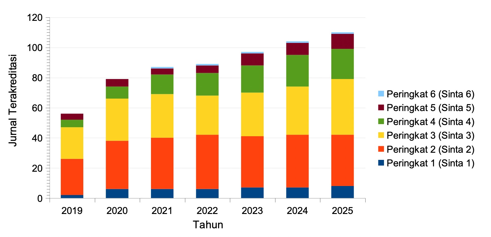 Berdasarkan peringkatnya, delapan jurnal terakreditasi S1, 34 jurnal S2, 37 jurnal S3, 20 jurnal S4, 10 jurnal S5, dan 6 jurnal S6.