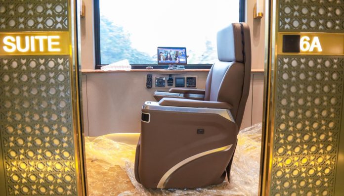 Masing-masing ruang privat Suite Class Compartment dilengkapi pintu geser otomatis, kursi reclining 180 derajat yang dapat difungsikan sebagai kasur, fitur pemanas dan pijat, serta baki lipat multifungsi untuk makan atau bekerja. Kursi dapat diputar sesuai arah perjalanan, menambah fleksibilitas dan kenyamanan.