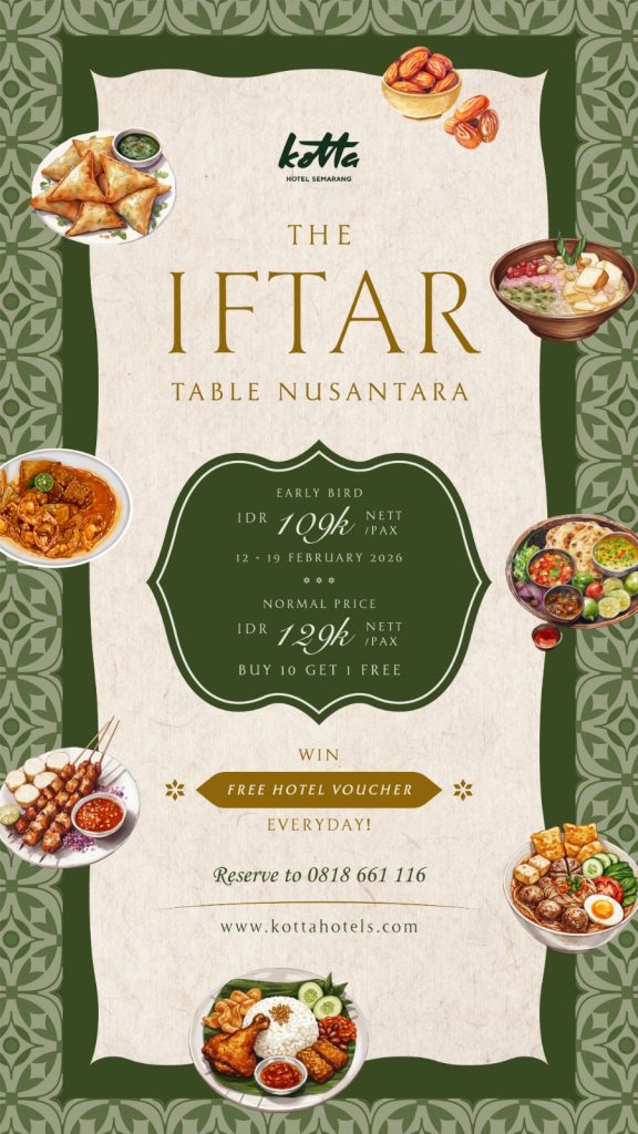 Kotta Hotel Semarang juga menghadirkan penawaran Early Bird Special dengan harga Rp109.000 nett per orang untuk periode pemesanan 12 hingga 19 Februari 2026. Setelah periode tersebut, harga normal berlaku Rp129.000 nett per orang. Tersedia pula promo Beli 10 Gratis 1 yang dapat dimanfaatkan untuk acara berbuka bersama keluarga, sahabat, maupun rekan kerja.